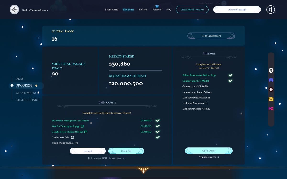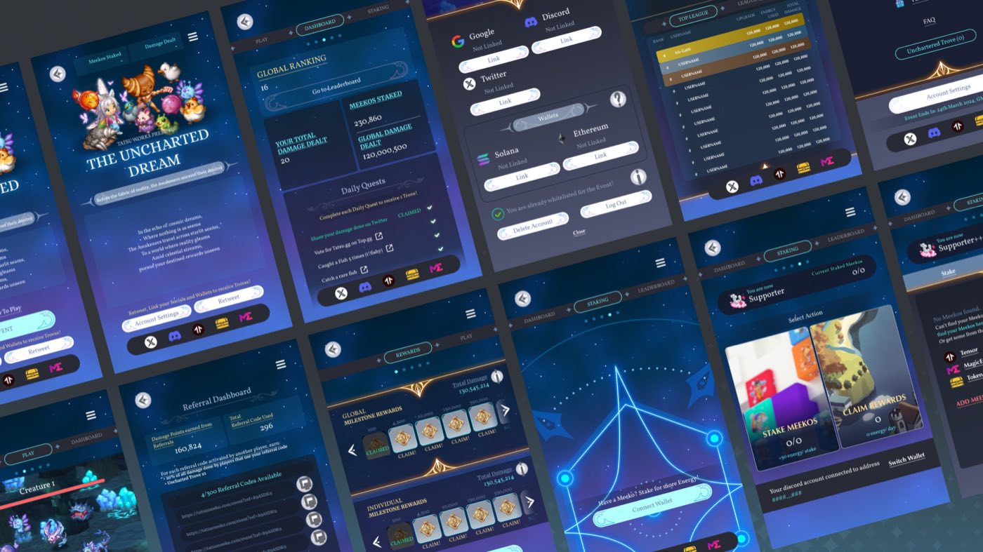 A 2024 Web3 event website where players could port existing NFTs to a newer platform and stake them for in-event benefits. Designed for both web and mobile, covering the full event experience: from onboarding and daily engagement loops to progression and reward systems.