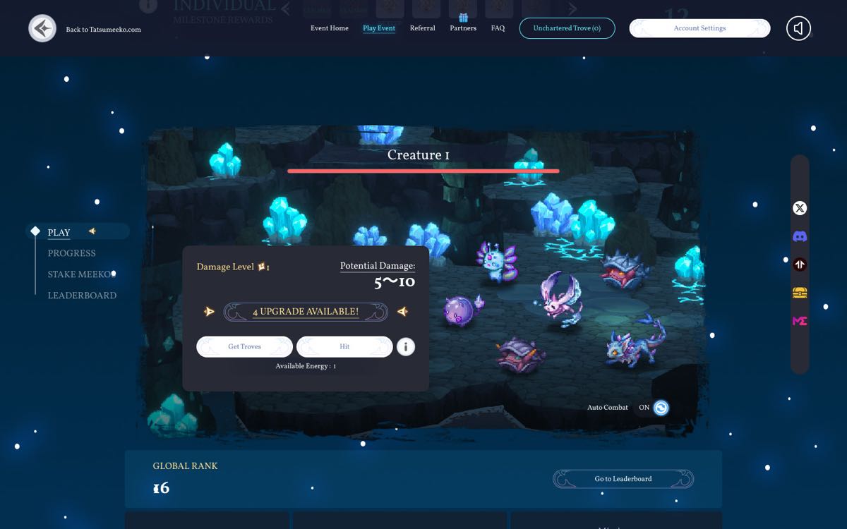 Upgrades act as a key progression lever, increasing damage output while incentivizing repeat engagement through referrals and daily activities.